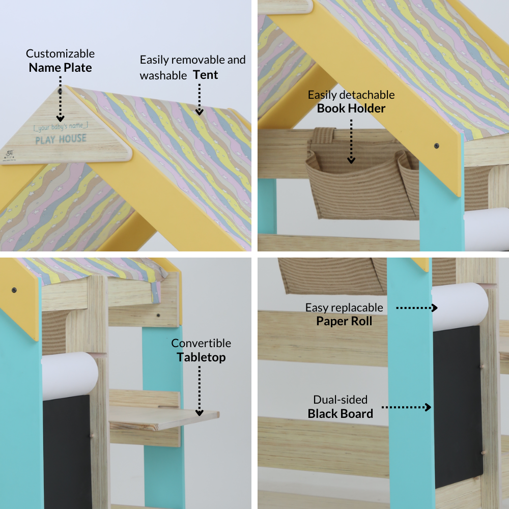 - This playhouse has multiple features other than being just a cozy toddler haven.