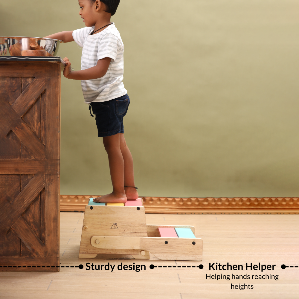 Ariro’s Step Stool enables children to reach new heights and accomplish tasks on their own, fostering independence, confidence, and self-esteem. It helps them take charge of daily routines and develop essential life skills.